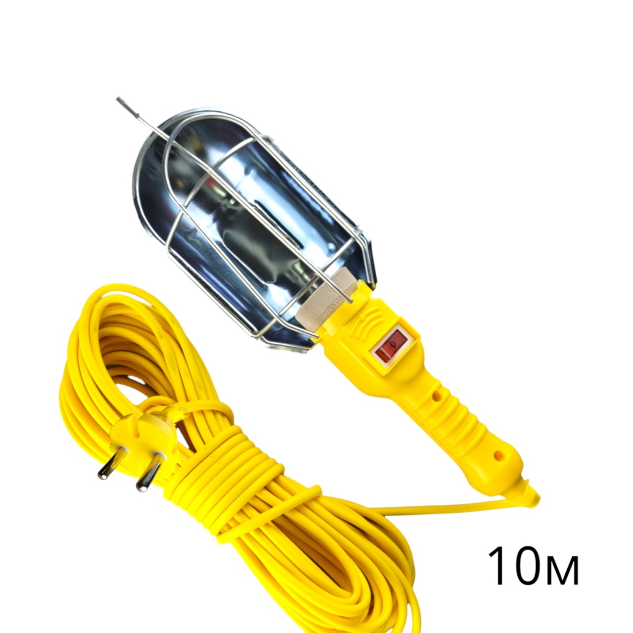 Гаражный светильник с проводом 10 метров оборудован клавишным выключателем, металлическим рассеивателем, а также защитной стальной решеткой.