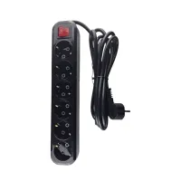 Черный удлинитель 3 метра от "MAXIMUM QUALITY TOOLS" создан с 6 розетками и евровилкой. Корпус длиной 330 мм. выполнен из черного негорючего АБС-пластика и подходит для использования только внутри помещений.